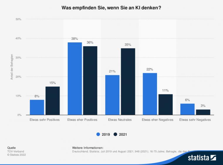 % der Befragten sind der Künstlicher Intelligenz gegenüber positiv eingestellt. Das ergab eine repräsentative Umfrage im Auftrag des Tüv-Verbandes unter der deutschen Bevölkerung über Künstliche Intelligenz. Im Jahr 2019 antworten in diese Richtung 46