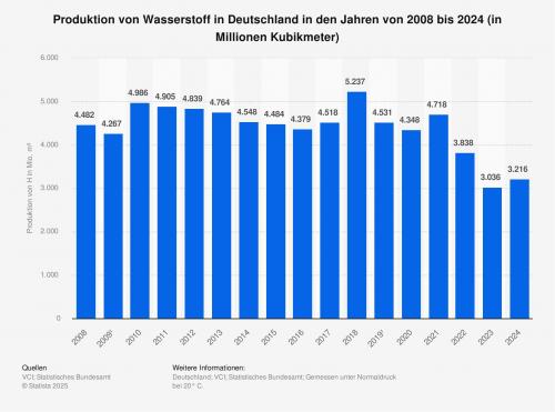 Das produzierte Volumen von Wasserstoff in Deutschland ist laut dem Statistischen Bundesamt im vergangenen Jahrzehnt tendenziell gesunken. Im Jahr 2024 wurden etwa 3,2