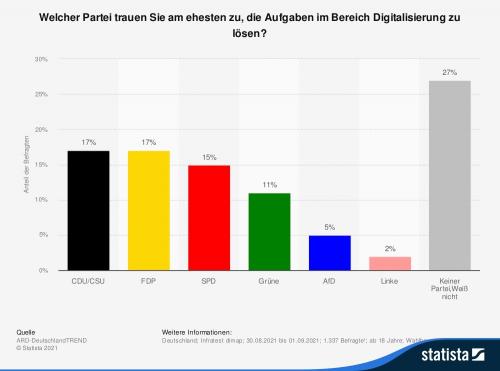 Die Mehrheit der für den ARD-Deutschland-Trend befragten Personen trauten es am ehesten der CDU/CSU und der FDP zu, die Aufgaben im Bereich Digitalisierung zu lösen. Jeweils 17 % der im September Befragten sahen bei den Christdemokraten und bei den Liberalen die größte Kompetenz.