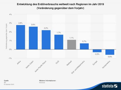 Die Statistik zeigt die Entwicklung des Erdölverbrauchs im Jahr 2019 im Vergleich zum Vorjahr nach Weltregionen. Demnach ist der Erdölverbrauch in Europa in diesem Zeitraum um rund 0,3 % zurückgegangen. Der weltweite Ölverbrauch insgesamt belief sich dagegen auf durchschnittlich rund 101 Millionen Barrel pro Tag. Den höchsten Zuwachs im Verbrauch des fossilen Energieträgers verbuchen Afrika und der Nahe Osten. Quelle: BP
