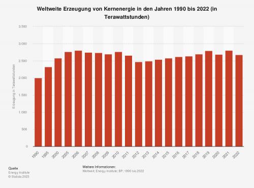 Prozent zugrunde gelegt wurde. Im Jahr 2022 belief sich der weltweite Verbrauch von Kernenergie demnach auf rund 2.679