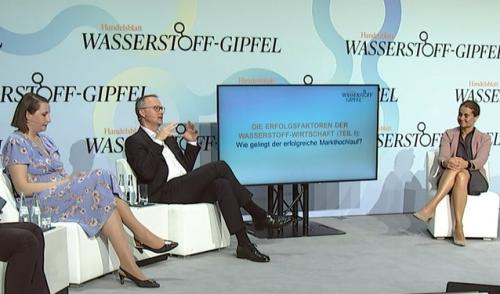 Bei der Diskussion auf dem Wasserstoffgipfel: v.l. Thekla von Bülow (Aurora Energy Research), Axel Wietfeld (CEO Uniper Hydrogen), Marie Jaroni (Thyssen Krupp Steel) Quelle: Handelsblatt |