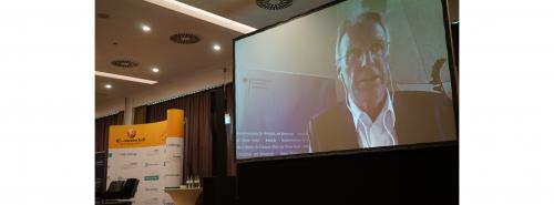 Zugeschaltet aus Berlin: Stefan Wenzel spricht für die Bundesregierung beim SZ-Führungstreffen am Vortag der Messe "E-world" 2023 in Essen. Quelle: Volker Stephan |