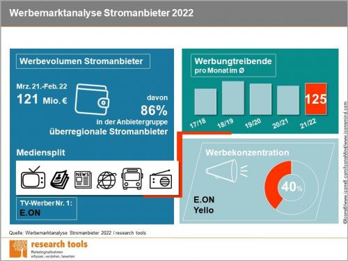 Die Werbungsausgaben der Stromanbieter in Deutschland und deren Vielfalt hat zugenommen, und 40 % entfallen auf Eon und die EnBW-Tochter Yello zusammengenommen. Überregionale Anbieter verbrauchten 86 % des Werbekuchens, während Stadtwerke auf niedrigem Niveau auf 8 % aufschlossen. Der Werbeanteil der Stadtwerke beläuft sich auf lediglich acht Prozent. Das ergibt die im Juni veröffentlichte kostenpflichtige "Werbemarktanalyse Stromanbieter 2022" von Research Tools. Demnach gaben Stromvertriebe von März 2021 bis Februar 2022 rund 121 Millionen Euro für die mediale Kommunikation aus. Das waren 8 % mehr als in den zwölf Monaten zuvor. Pro Monat werben im Strommarkt durchschnittlich 125 Marken - ein Plus von 10 %. Erwartungsgemäß konzentrierten sich die Spendings auch diesmal auf Oktober und November, das Jahr 2022 startete hingegen werbeschwach. Mit einem Ausgabenanteil von 44 % ist das Fernsehen der bedeutsamste Kommunikationskanal, gefolgt von Internetwerbung, in die jeder dritte Werbeeuro fließt. Im Branchenvergleich stark präsentieren sich die Stromanbieter mit 11 % Außenwerbung. Überregionale Anbieter sind in der Medienlandschaft am präsentesten.