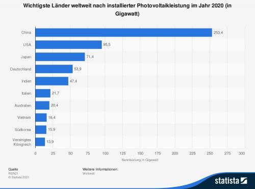 Im Jahr 2020 erreichte die kumulierte installierte Leistung durch Photovoltaikanlagen in China rund 253.000 MW – das entspricht einem Anteil von knapp 33 % an der weltweit installierten PV-Leistung. Es folgten die die USA, Japan und Deutschland.