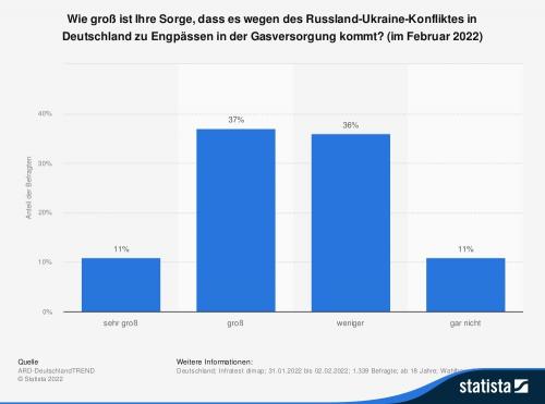 Laut einer Umfrage im Rahmen des ARD-Deutschland-Trends im Februar 2022 bewerteten 48 Prozent der Befragten ihre Sorge von Lieferengpässen bei der Gasversorgung durch den Russland-Ukraine-Konflikt als groß bzw. sehr groß. 47 Prozent machten sich angesichts des Konflikts im Osten Europas keine Sorgen.