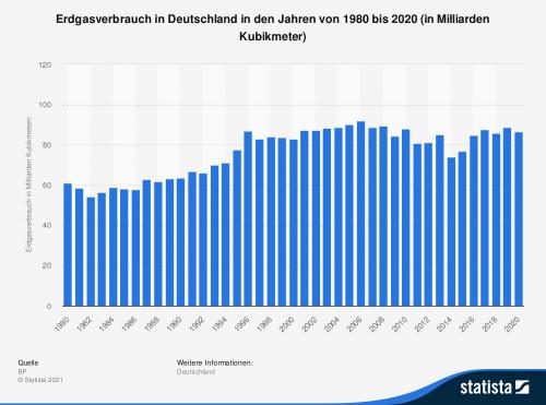 Der Erdgasverbrauch in Deutschland ist auf hohem Niveau. Der Konsum von Erdgas ist in den vergangenen vierzig Jahren seit 1980 bis zum Jahr 2020 graduell gestiegen – auf ein Niveau von 87