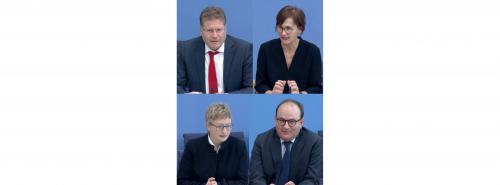 von links oben nach rechts unten Staatssekretär Patrick Graichen (BMWK), Ministerin Bettina Stark-Watzinger (BMBF) und die Co-Vorsitzenden des Lenkungskreis WPKS, Sabine Schlacke und Ottmar Edenhofer Quelle: BPK |