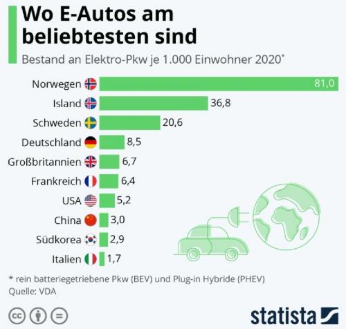 In China gibt es in absoluten Zahlen die meisten Elektroautos weltweit. Auf 1.000 Einwohner gerechnet sieht die Reihenfolge der Länder jedoch ganz anders aus. Dann liegt Norwegen mit rund 81 E-Autos einsam an der Spitze des Rankings. Das zeigt die Statista-Grafik auf Basis von Daten des deutschen Verbands der Automobilindustrie.