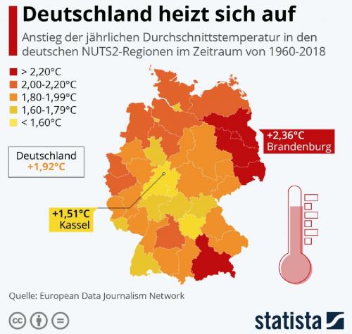 Die jährliche Durchschnittstemperatur ist in Deutschland seit 1960 um etwa zwei Grad Celsius gestiegen. Dabei hat sich das Land nicht überall gleichermaßen aufgeheizt, wie die Statista-Grafik auf Basis der vom European Data Journalism Network aufbereiteten Daten zeigt. So haben sich die sogenannten NUTS2-Regionen im Zentrum der Bundesrepublik weniger stark erwärmt als zum Beispiel der Osten und die bayerischen Alpengebiete. NUTS ist eine Systematik zur