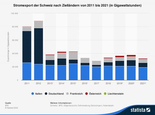 Die Statistik veranschaulicht auf Basis von Zahlen des Bundesamtes für Energie (BFE) die von der Schweiz exportierten Strommengen nach Zielländern von 2011 bis 2021. Demnach exportierte die Schweiz im Jahr 2021 rund 7