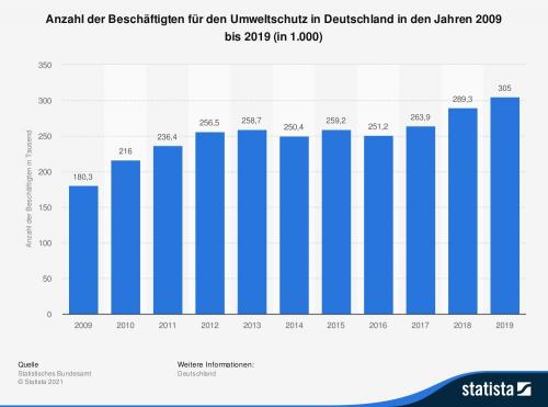 Die Statistik zeigt die Anzahl der Beschäftigten für den Umweltschutz in Deutschland in den Jahren 2009 bis 2019. Laut den vom Statistischen Bundesamt im Juni 2021 veröffentlichten Zahlen waren im Jahr 2019 rund 305.000 Personen in Deutschland mit der Herstellung von Umweltschutzgütern sowie mit dem Erbringen von Umweltschutzleistungen beschäftigt. Seit 2016 steigt die zahl der Beschäftigten im Umweltschutz-Sektor stetig an.