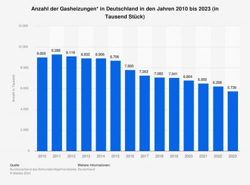 Die Statistik zeigt die Entwicklung der Anzahl von Gasheizungen in Deutschland in den Jahren 2010 bis 2023. Im Jahr 2023 waren in Deutschland rund 5,7 Millionen Gasheizungen in Betrieb.