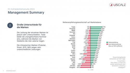 Axel Sprenger, Gründer und Geschäftsführer U-Scale resümierte: „Die Performance und die Qualität der E-Autos sind deutlich besser geworden, aber die Liste der Hausaufgaben bleibt lang.“ Deutliche Unterschiede sieht er bei den Marken. So würden 71