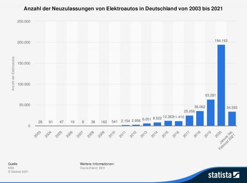 Rekordwert bei den Neuzulassungen von Elektroautos in Deutschland: 2020 wurden rund 194.200 Pkw mit reinem Elektroantrieb neu zugelassen. Im Vergleich zum Vorjahr entspricht das einer Verdreifachung der Zahl. Auch 2021 startete rekordverdächtig: Schon im Februar war fast der Jahreswert von 2018 erreicht.