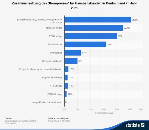 Die Statistik zeigt die Zusammensetzung des Strompreises für Haushaltskunden in Deutschland im Jahr 2021. Der Posten "Nettonetzentgelt" betrug machte rund 22 % des gesamten Strompreises für Haushaltskunden aus.