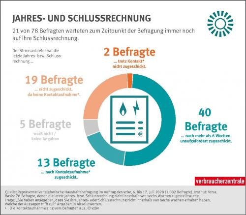 Laut Verbraucherzentralebundesverband (VZBV) beschweren sich Energiekunden in Deutschland häufig, weil sie zu lange auf die Auszahlung von Guthaben oder Boni durch ihren Anbieter warten müssen. Das Forsa-Meinungsforschungsinstitut führte deshalb im Juli 2020 eine repräsentative Haushaltsbefragung unter mehr als 1.000 Stromkunden durch. Danach haben hochgerechnet mindestens zwei Mio. Haushalte ihre letzte Jahres- oder Schlussrechnung nicht fristgerecht innerhalb von sechs Wochen nach Ablauf des Belieferungsjahres beziehungsweise des Vertrages erhalten.
