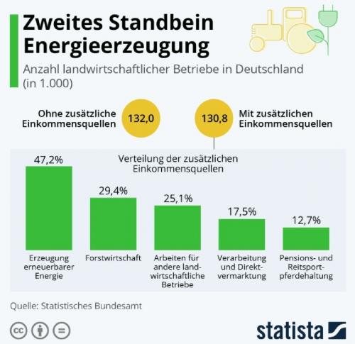 130.800 landwirtschaftliche Betriebe in Deutschland setzen laut Statistischem Bundesamt auf zusätzliche Einkommensquellen - das entspricht etwa der Hälfte landwirtschaftliche Betriebe. Auf diese Weise versuchen Landwirtinnen und Landwirte das Risiko von starken Einkommensschwankungen abzufedern. An erster Stelle steht dabei mit 47 Prozent die Erzeugung erneuerbarer Energien. Das spart einerseits Kosten bei der eigenen Stromversorgung und generiert einen Zusatzverdienst. Der Agentur für Erneuerbare Energien AEE zufolge gehörten 2019 rund zehn Prozent der Erneuerbare-Energie-Anlagen landwirtschaftlichen Betrieben.