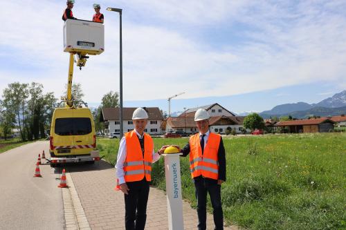 Freilassings Bürgermeister Markus Hiebl (r.) und Bayernwerk-Vorstand Egon Leo Westphal nehmen die 500.000. LED-Leuchte in Betrieb Quelle: Bayernwerk / Bartels |