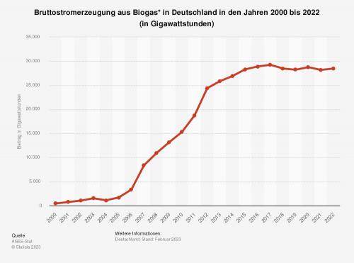 Die Statistik zeigt die Entwicklung der Bruttostromerzeugung aus Biogas (inklusive Biomethan) in Deutschland in den Jahren 2000 bis 2022 nach Zahlen von AGEE STat.. Im Jahr 2022 wurden rund 28,5