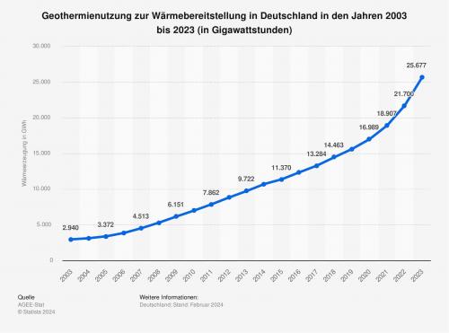 Die Statistik bildet die Entwicklung der Geothermienutzung zur Wärmebereitstellung in Deutschland in den Jahren 2003 bis 2023 ab. Im Jahr 2023 wurden rund 26 Terawattstunden Energie zur Wärmebereitstellung in Deutschland aus Geothermieanlagen gewonnen.