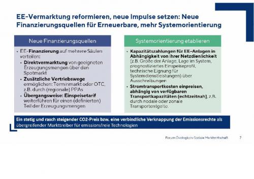 Marie Wettingfeld, Referentin im FÖS, erläuterte: "Das zukünftige Energiemarktdesign muss die physikalischen Realitäten und die Marktregeln zusammenbringen." Das solle über Regeln und Preise geschehen, die Netzengpässe und eine ungleiche regionale Verteilung der erneuerbaren Erzeugung "ehrlich abbilden". Eine kapazitätsbezogene Systemdienlichkeitskomponente bei der Förderung der Erneuerbaren könne dafür sorgen, dass sie mehr zur Systemstabilität beitragen und so der Bedarf an fossilen Reservekapazitäten sinkt.