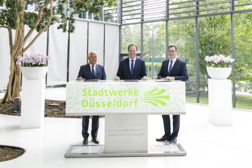 Der Stadtwerke-Aufsichtsratsvorsitzende und EnBW-Vorstand Hans-Josef Zimmer, Oberbürgermeister Stephan Keller und der Vorstandsvorsitzende Julien Mounier (von links) Quelle: Stadtwerke Düsseldorf / Ulrik Eichentopf |