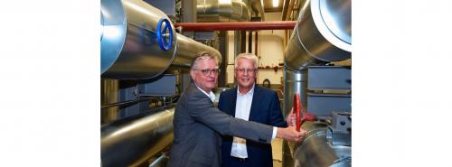 IPA-Geschäftsführer Martin Popp und Stadtwerke-Geschäftsführer Alfred Müllner (links) nehmen die Übergabestation des neuen Fernwärmeanschlusses des Industrieparks Augsburg in Betrieb