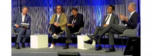 Diskussion auf dem H2 Forum: (v.li). Matthias Tomenendal (Berlin School of Economics and Law - Moderator), Lars Baumgürtel (ZINQ Group), Ulf Gehrckens (Aurubis), Gilles Le Van (Air Liquide), Carsten Rolle (BDI)