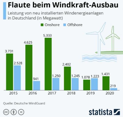 Der Ausbau der Windkraft in Deutschland ist in den letzten Jahren ins Stocken geraten. Das zeigt die Statista-Grafik auf Basis von Daten der Firmengruppe Deutsche WindGuard. Insbesondere der Ausbau der Offshore-Anlagen ist zuletzt massiv zurückgegangen. Im Jahr 2020 wurden in Deutschland 32 Offshore-Windenergieanlagen (WEA) mit einer Leistung von 219 Megawatt neu in Betrieb genommen. Gegenüber 2019 ergibt sich damit ein Marktrückgang von 82 Prozent.