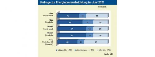 Der Preiseinbruch in der Woche vor Pfingsten wurde nicht als eine Trendwende aufgefasst. Vielmehr gehen die Teilnehmer überwiegend davon aus, dass die Preise auch im Juni nach oben gehen dürften. Lediglich bei den CO2-Emissionsrechten entfällt der höchste Anteil auf fallende Notierungen. Angesichts der hohen Korrelation zwischen EUA-Future und dem Cal 22 bei Phelix-Baseload ist dies überraschend.