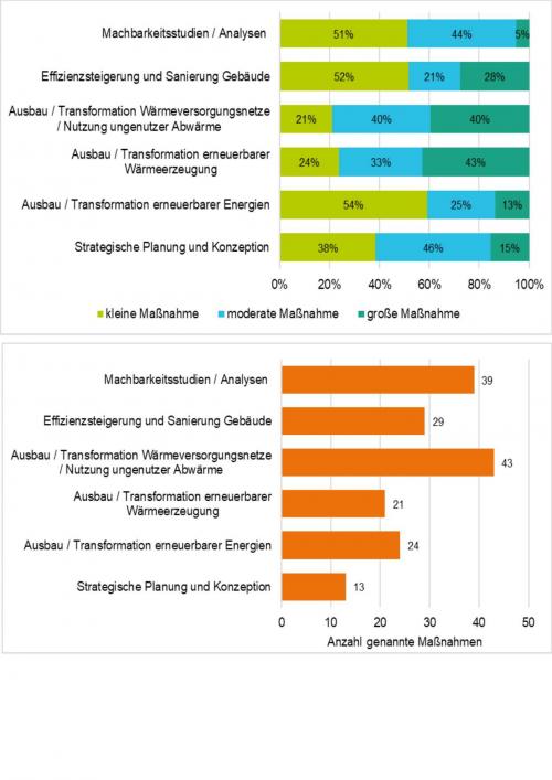 Die aufgeführten Maßnahmen lassen sich laut ISI in die folgenden sechs Kategorien einteilen: Machbarkeitsstudien, Effizienzsteigerung und Sanierung von Gebäuden, Ausbau und/oder Transformation von Wärmeversorgungsnetzen und/oder Nutzung ungenutzter Abwärme, Ausbau und/oder Transformation erneuerbarer Wärmeerzeugung, Ausbau und/oder Transformation erneuerbarer Energien, Strategische Planung und Konzeption.