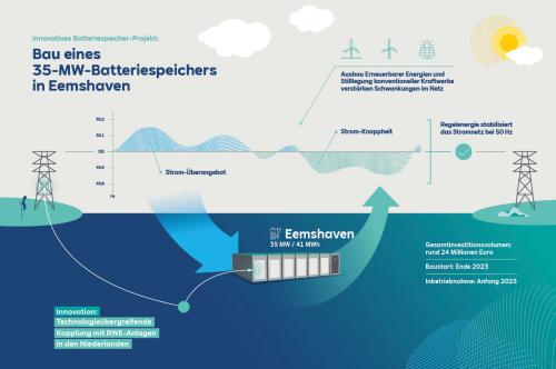 Das Eemshavener Projekt ist im Zusammenhang mit dem weltweiten Zubau von RWE-Speichern zu sehen, die außer in Europa auch in Australien und den USA entstehen. Bis 2030 sollen so Stromspeicher mit einer Leistung von über 3.000 MW zur Verfügung stehen. Zuletzt ging in Lingen (Emsland) und im nordrhein-westfälischen Werne ein System mit 117 MW in Betrieb, das RWE als vernetzte Batterie bezeichnet.
