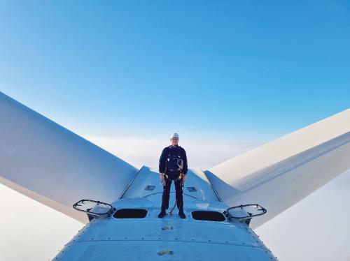 Über den Wolken muss die Freiheit wohl grenzenlos sein, sang dereinst Reinhard Mey. Was für den Liedermacher die Aussicht von einem Flugplatz nach oben ist, ist für den abgebildeten Thoralf Taft der grandiose Blick von der Gondel einer Onshore-Windkraftanlage. Die Aussicht entschädigt bei der jährlichen Begehung der eigenen Anlagen für den mühsamen Aufstieg. Taft arbeitet bei der technischen Betriebsführung Windkraft des Schweriner Regionalversorgers Wemag. 2022 nahm dieser 268