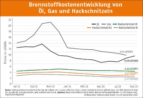 Der Erdgas-Endkundenpreis ist im dritten Quartal nur leicht von einem relativ hohen Niveau aus gesunken. Der Konkurrenzenergieträger Hackschnitzel blieb dagegen preislich quasi stabil.