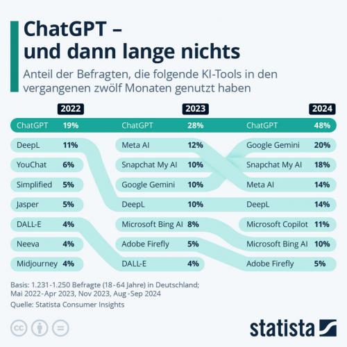 ChatGPT bleibt auch 2024 das meistgenutzte Programm, das auf generativer KI basiert. 48 Prozent der im Rahmen der Statista Consumer Insights befragten Deutschen gaben an, im vergangenen Jahr das bekannteste Produkt der Softwarefirma Open AI genutzt zu haben. Der Vergleich mit Befragungen aus den Jahren 2022 und 2023 zeigt zudem, dass sich der entsprechende Anteil seit der ersten Umfragewelle von Mai 2022 bis April 2023 mehr als verdoppelt hat und seit November 2023 um rund 20 Prozentpunkte gestiegen ist. Mit DeepL ist auch ein deutsches Produkt in jeder Umfrage in den Top 5 vertreten.