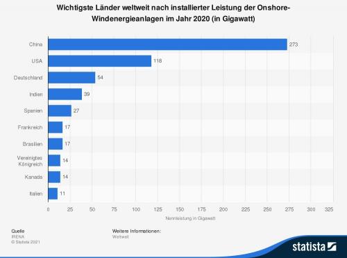 top war 2020 die Volksrepublik China mit 273.000 MW installierter Onshore-Windleistung.