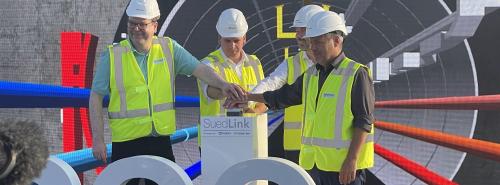 Von 3 auf vorläufig 10 Milliarden Euro: die Stromautobahn Südlink, hier der offizielle Baustart des Schachtbauwerks für die Elbquerung im September mit (v.r.) Robert Habeck (Vizekanzler), Tim Meyerjürgens (COO Tennet), Joschka Knuth (Staatssekretär Energiewendeministerium Schleswig-Holstein), Christian Meyer (Umweltminister Niedersachsen) Quelle: E&M/Georg Eble |