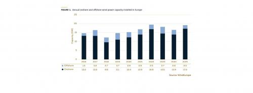 Europäischer Windkraftausbau nach Leistung 2016-2025 an Land und auf See (zur Vollansicht bitte auf die Grafik klicken) Quelle: Wind Europe |
