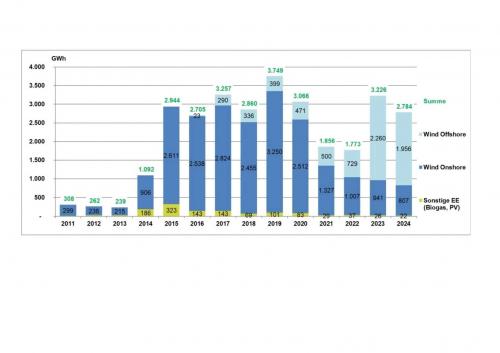 Engpass durch Netzausbau behobenIm Jahr 2023 war die abgeregelte Strommenge aufgrund von Engpässen im Höchstspannungsnetz stark angestiegen. Bereits im Jahr darauf machte sich allerdings eine neue 380-kV-Leitung bemerkbar, mit welcher der Hauptengpass behoben werden konnte. Ebenso habe die schrittweise Stilllegung fossiler Kraftwerke im Norden mehr Platz für die Aufnahme regenerativen Stroms geschaffen.