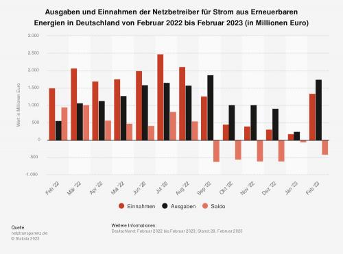 Die Statistik zeigt die Ausgaben und Einnahmen der Netzbetreiber für Strom aus erneuerbaren Energien in Deutschland von Februar 2022 bis Februar 2023 nach Angaben von "netztransparenz.de". Im Februar 2023 betrugen die Einnahmen aus der Umlage nach dem Erneuerbare-Energien-Gesetz sowie aus den Verkaufserlösen für Ökostrom rund 1.335