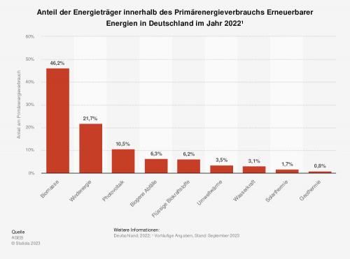 Innerhalb der erneuerbaren Energien hat der Energieträger Biomasse im Jahr 2023 die meiste Primärenergie gestellt. Der Anteil an den gesamten regenerativen Energien betrug der Arbeitsgemeinschaft Energiebilanzen (Ageb) zufolge 46,2