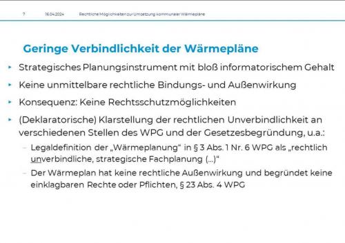 Im Seminar wurden die rechtlichen Grundlagen der KWP von Oliver Antoni von der Stiftung Umweltenergierecht erläutert. Er verwies auf die bislang geringe rechtliche Verbindlichkeit kommunaler Wärmepläne. Zudem sieht er eine Anpassung des rechtlichen Rahmens für den Anschluss- und Benutzungszwang als notwendig an, damit sich neu errichtete Fernwärmenetze wirtschaftlich tragen können.