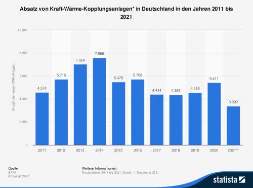 Die Statistik zeigt auf Basis von Werten des Bundesamte für Wirtschaft und Ausfuhrkontrolle (BAFA) die Anzahl der neu installierten und durch das Kraft-Wärme-Kopplungsgesetz geförderten Kraft-Wärme-Kopplungsanlagen in Deutschland in den Jahren 2011 bis 2021. Im Jahr 2021 (vorläufige Zahl) wurden demnach in Deutschland 3.392 neue Kraft-Wärme-Kopplungsanlagen in Betrieb genommen.