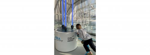Oder bei Stensea − Stored Energy in the Sea. Das Fraunhofer-Institut für Energiewirtschaft und Energiesystemtechnik hatte die Idee eines Meerespumpspeichers. Hohle Betonkugeln werden dabei auf dem Meeresboden verankert und mit Luft oder Wasser gefüllt. Im Vorbeiströmen an einer Turbine wird so Strom aus Offshore-Windparks dort gespeichert. Hier muss der Besucher fest eine Stange in die Installation hineindrücken, um das Prinzip des Pumpspeicherkraftwerks zu simulieren.