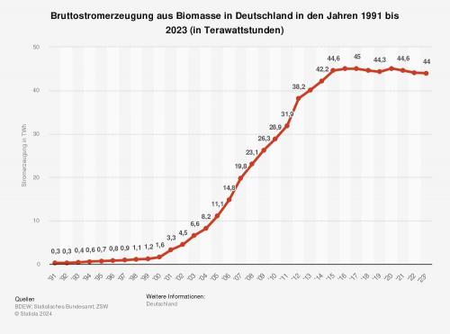 Die Statistik zeigt die Entwicklung der Bruttostromerzeugung aus Biomasse in Deutschland in den Jahren 1991 bis 2023 nach Zahlen des BDEW, des ZSW und des Statistischen Bundesamtes. Im Jahr 2023 betrug die produzierte Menge an Strom aus dem alternativen Energieträger Biomasse in Deutschland 44