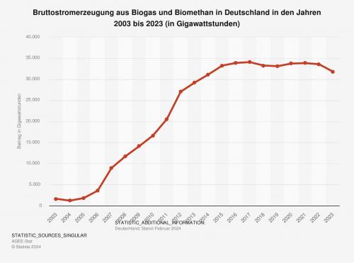Die Statistik zeigt die Entwicklung der Bruttostromerzeugung aus Biogas (inkl. Biomethan) in Deutschland in den Jahren 2003 bis 2023 nach Zahlen von AGEE-Stat.. Im Jahr 2023 wurden rund 31,8