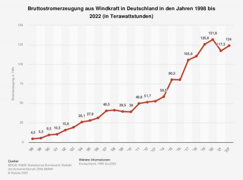 Die Statistik zeigt die Entwicklung der Bruttostromerzeugung aus Windkraft in Deutschland in den Jahren 1998 bis 2022 nach Zahlen von BDEW, AGEB, BMWK, Statistischem Bundeamt, Statistik der Kohlenwirtschaft udn ZSW. Im Jahr 2022 wurden in Deutschland rund 124