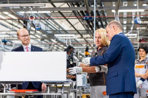 | Bundeskanzler Olaf Scholz unterstützte die Mitarbeiterinnen und Mitarbeiter in der Produktion und fügte zwei Teile einer hochmodernen Wärmepumpe zusammen Quelle: Viessmann |