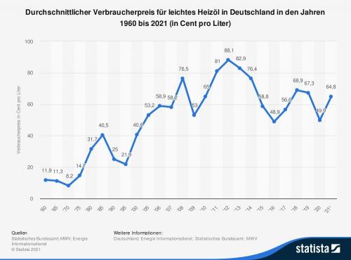 Der durchschnittliche Verbraucherpreis für leichtes Heizöl in Deutschland ist - trotz zum Teil erheblicher Schwankungen - im langjährigen Mittel auf ein Durchschnittsniveau im laufenden Jahr von 64,8